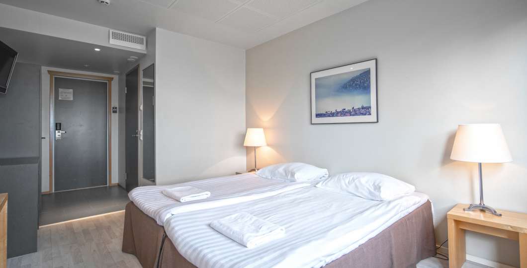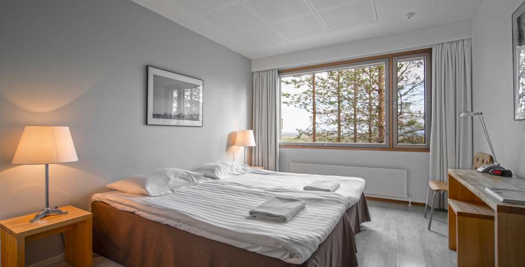 Twin room comes with 80cm wide twin beds, flat-screen TV and desk. The bathroom features a shower cabin. Most of the rooms are facing east, overlooking the fell. You can book an extra bed for an adult or a child. The extra bed fee for an adult is €42,50/night, and €27,50/night for a child. Families with small children can book a cot from the reception. The cot fee is €15/booking.
