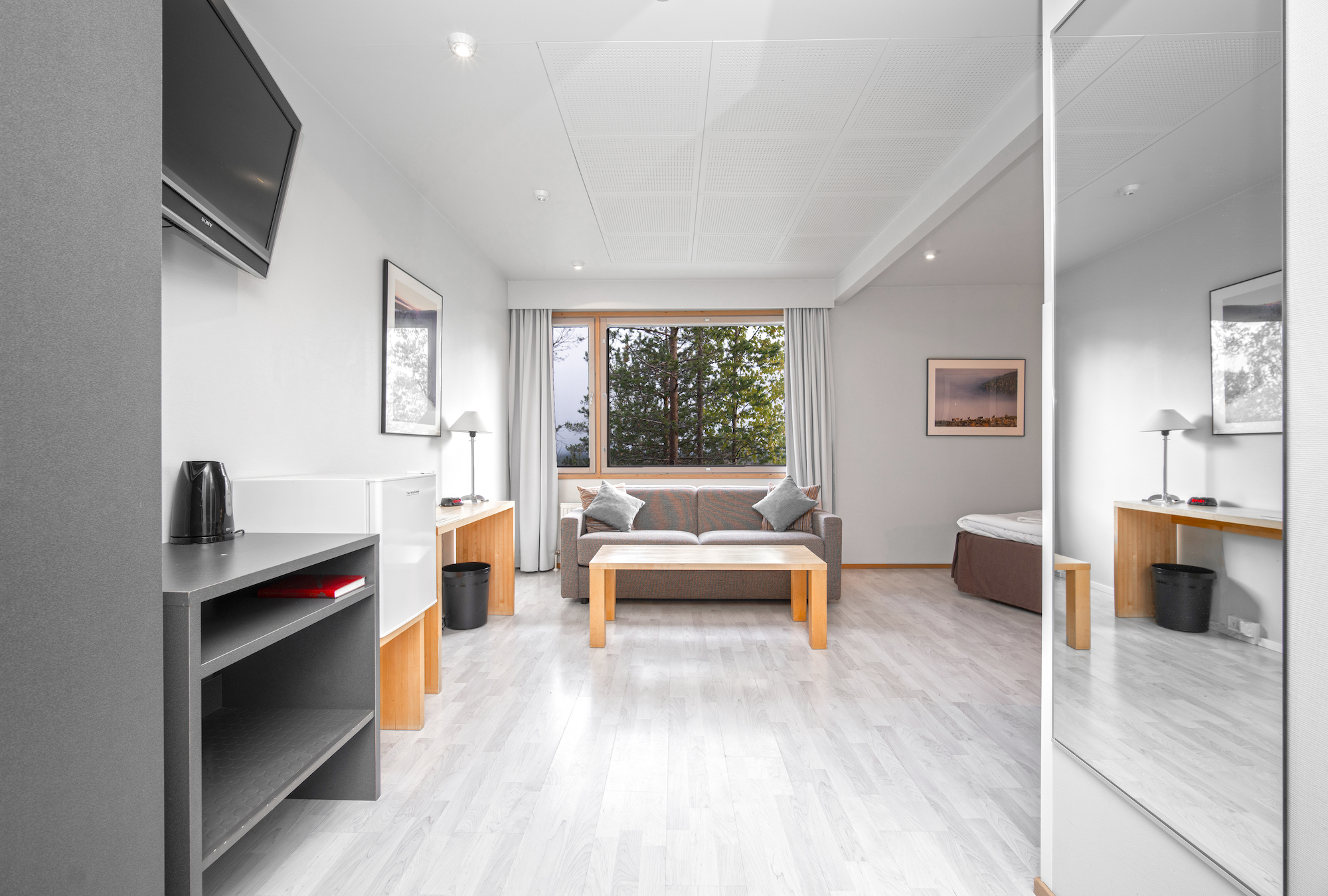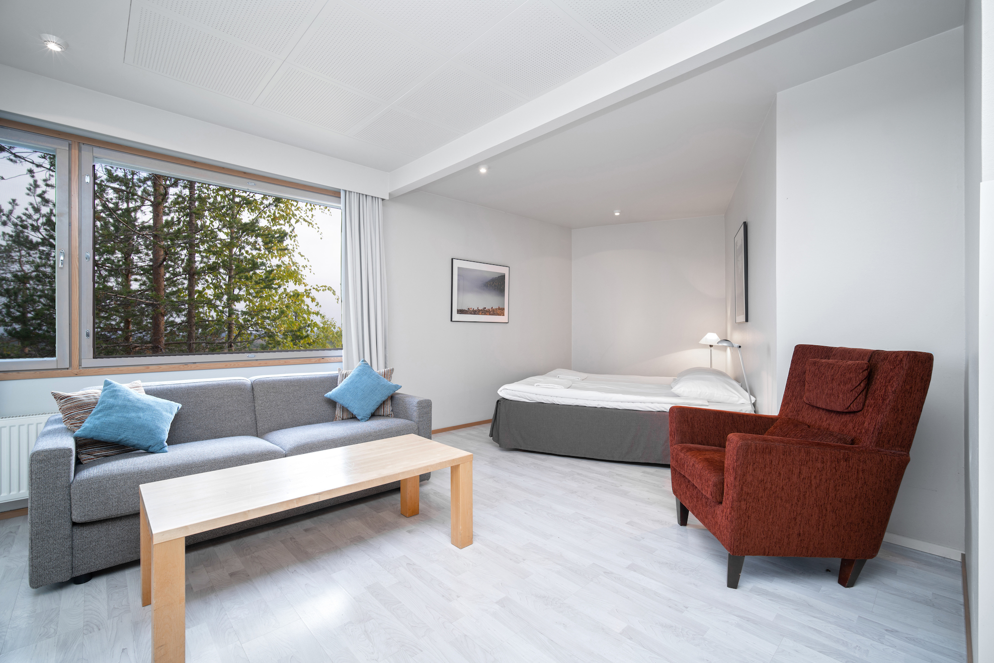 Superior room comes with 80cm wide twin beds and a sofa bed that can be used as an extra bed. The bathroom features a shower cabin. There is a flat-screen TV in the living room area. Most of the rooms are facing east, overlooking the fell.