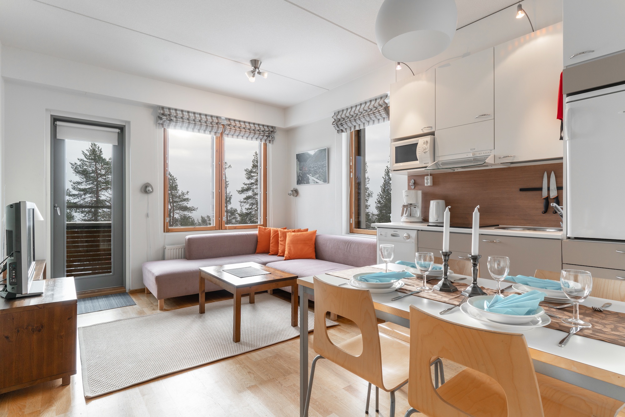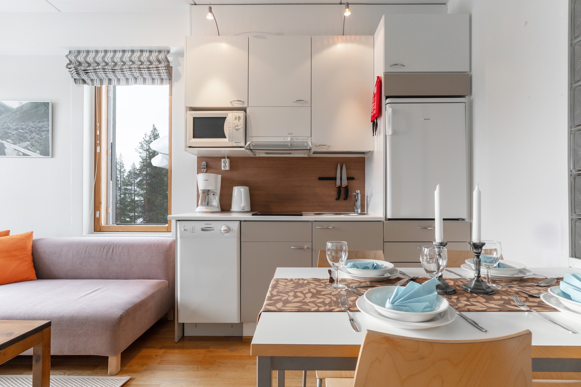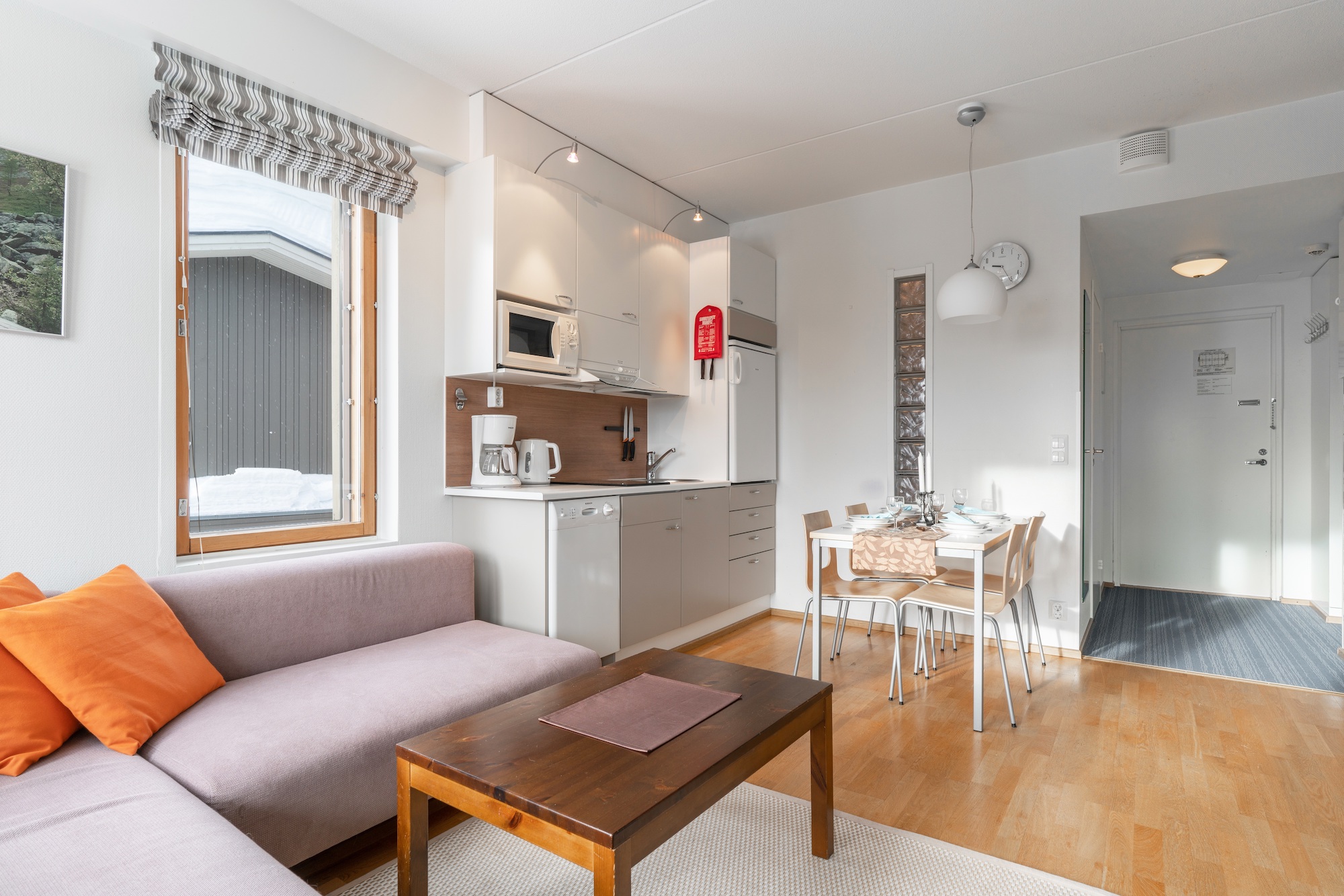 PyhäSuites43 apartments have a practical layout. The main bedroom beds are all prepared, and the bunk bed in the separate sleeping alcove has an 80 cm top bed and an 120 cm bottom bed. In the living room area, the sofa bed can be used as an extra bed for one person free of charge. Families with small children (aged 0‒2 yrs) can book a cot at the reception or from the sales office. The cot fee is €15/booking (limited number of cots available). A well-equipped kitchenette with a stove, 4-person dining area, private sauna, separate WC, and spacious balcony ensure a smooth vacation.