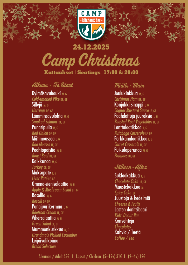 Gather your loved ones and experience the spirit of Christmas at Camp. Our festive buffet offers traditional Finnish delicacies and seasonal treats in a cozy, joyful setting. Join us on Christmas Eve, December 24th, 2025, with two seatings available at 5:00 PM and 8:00 PM.